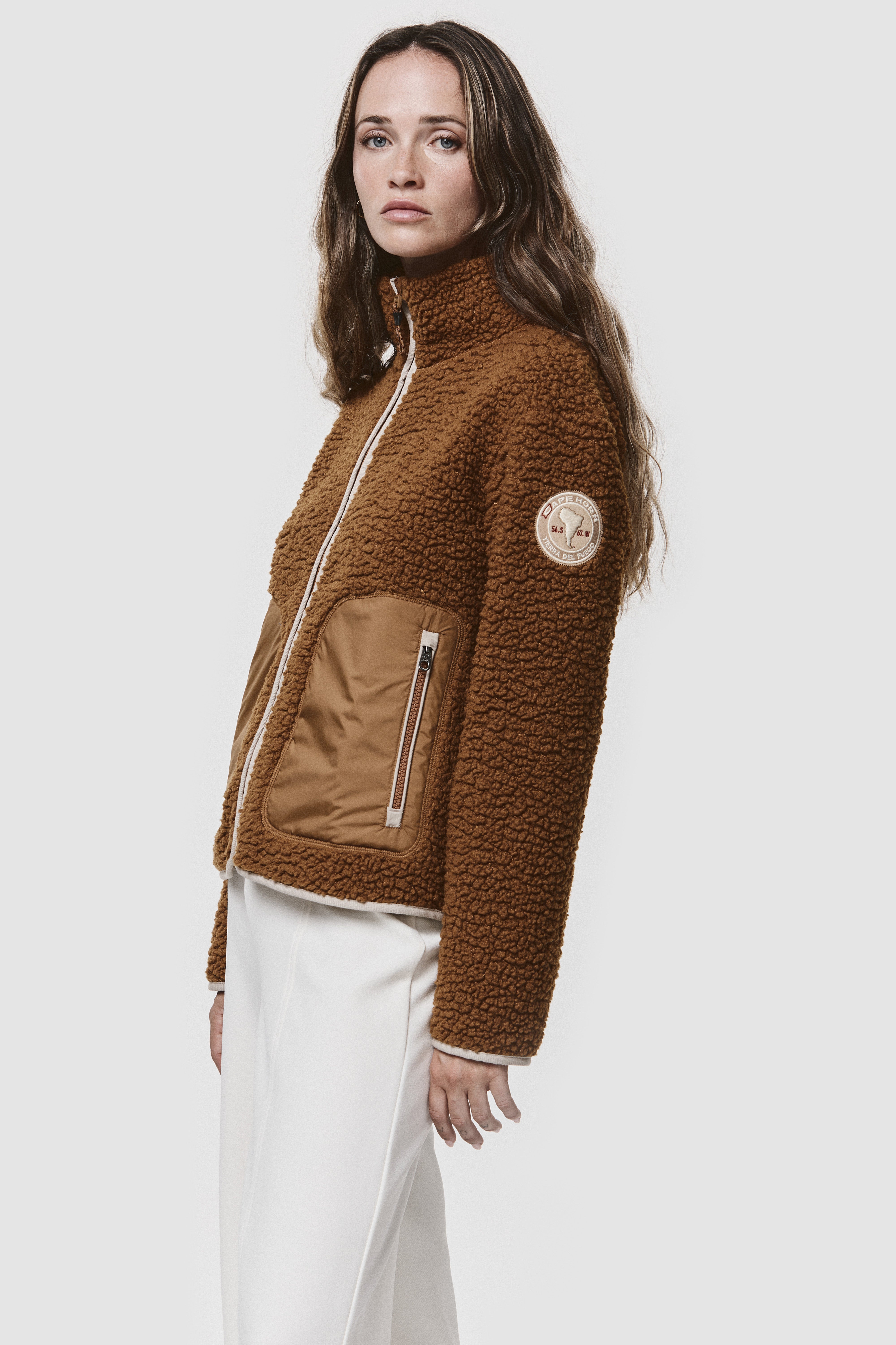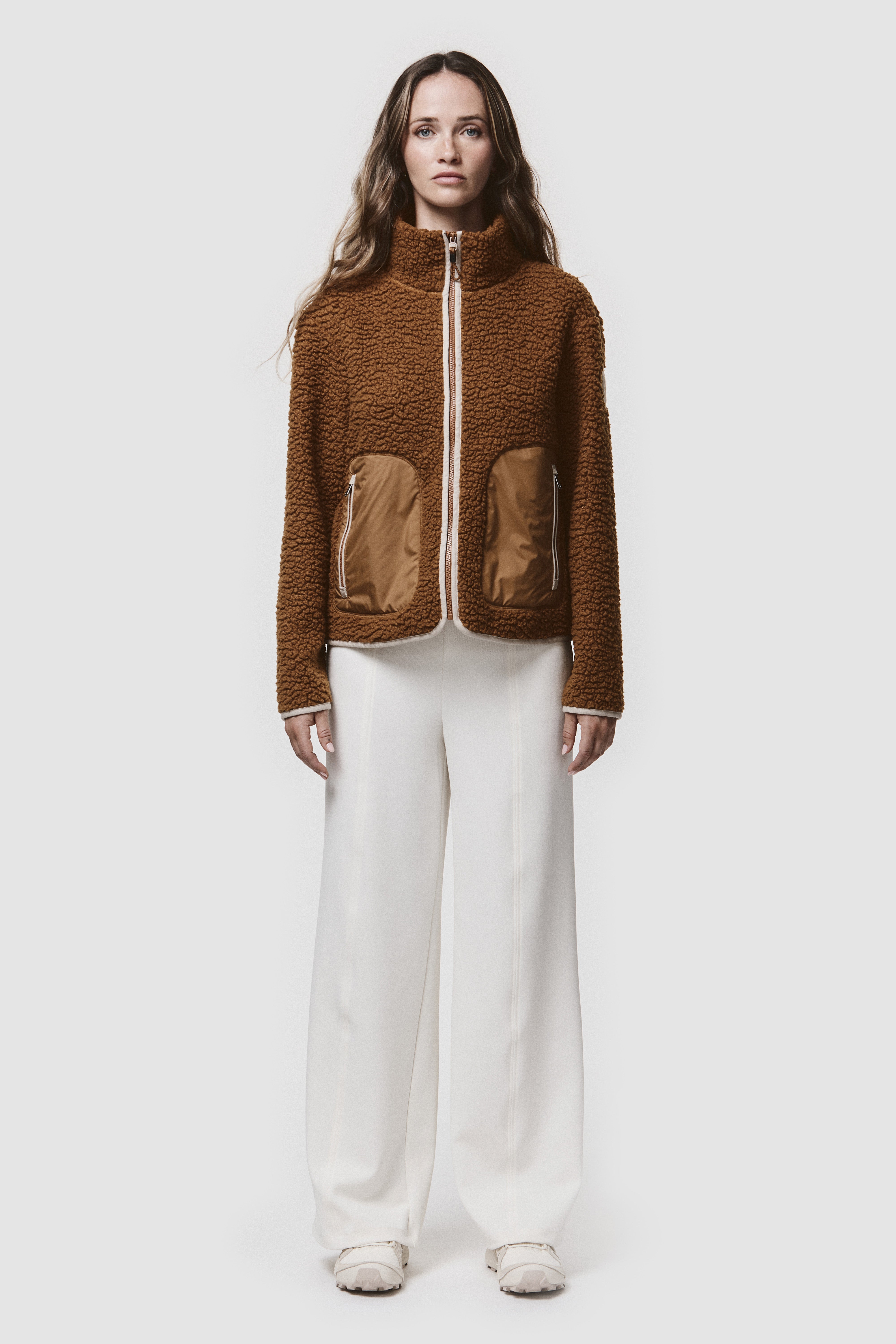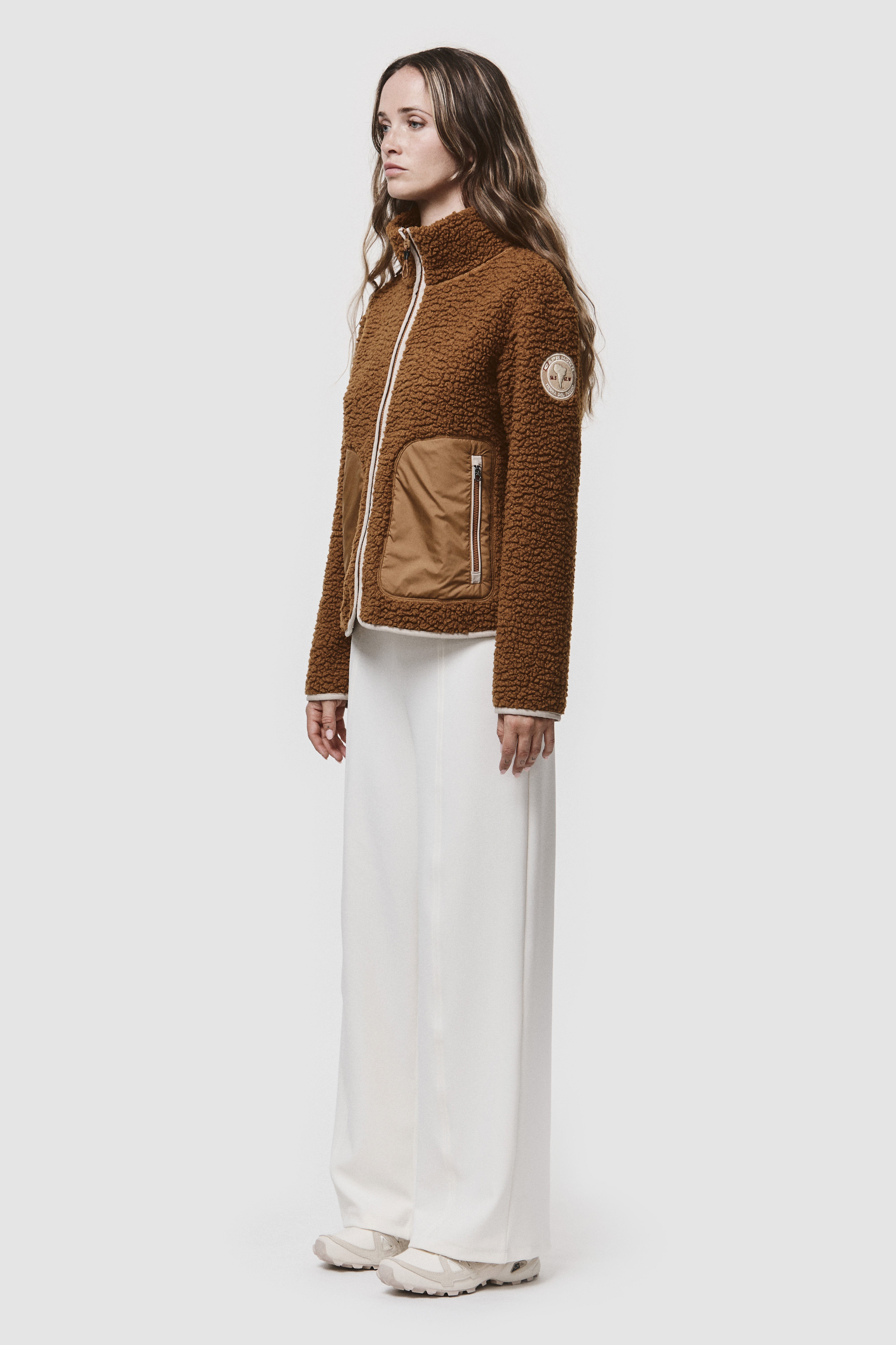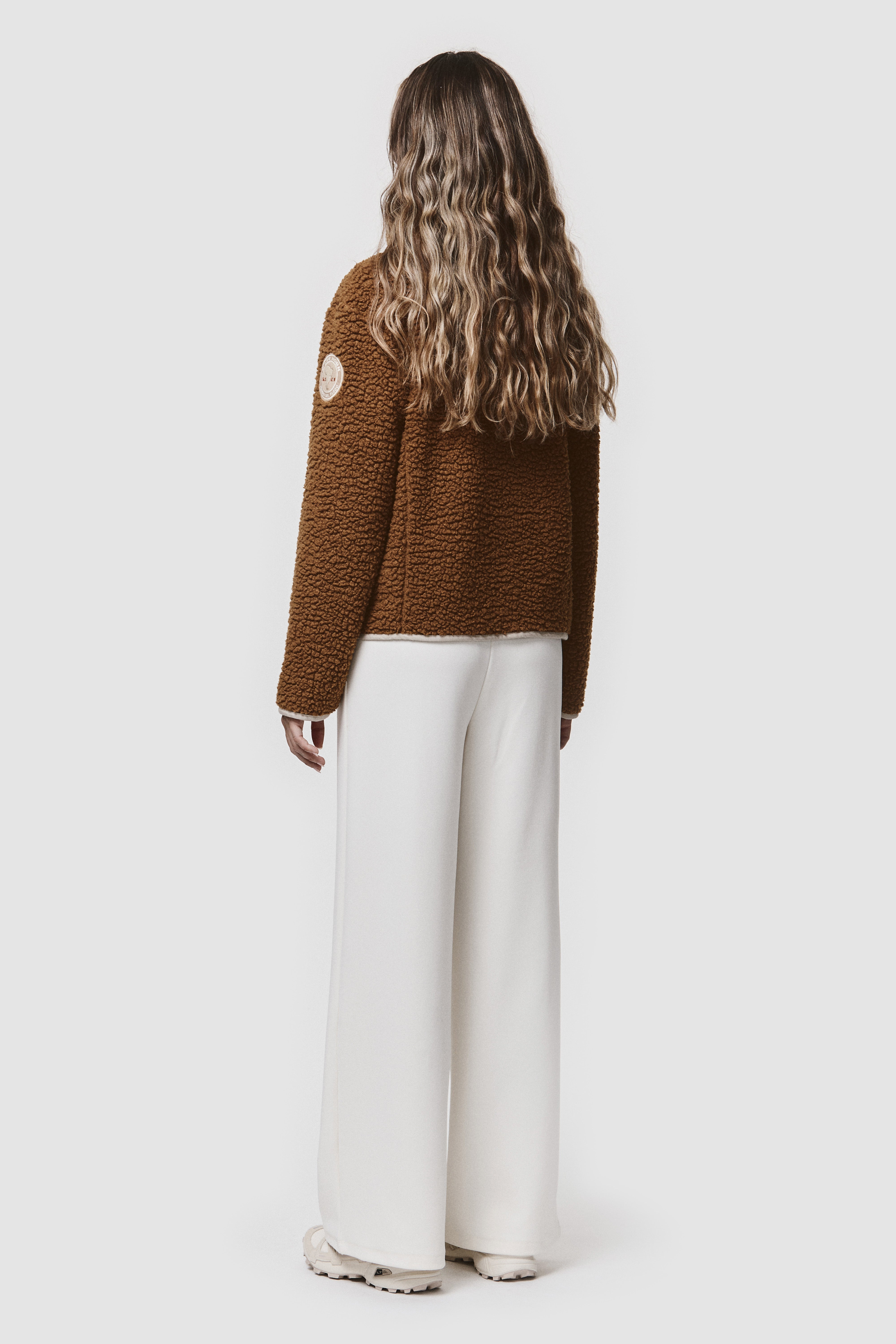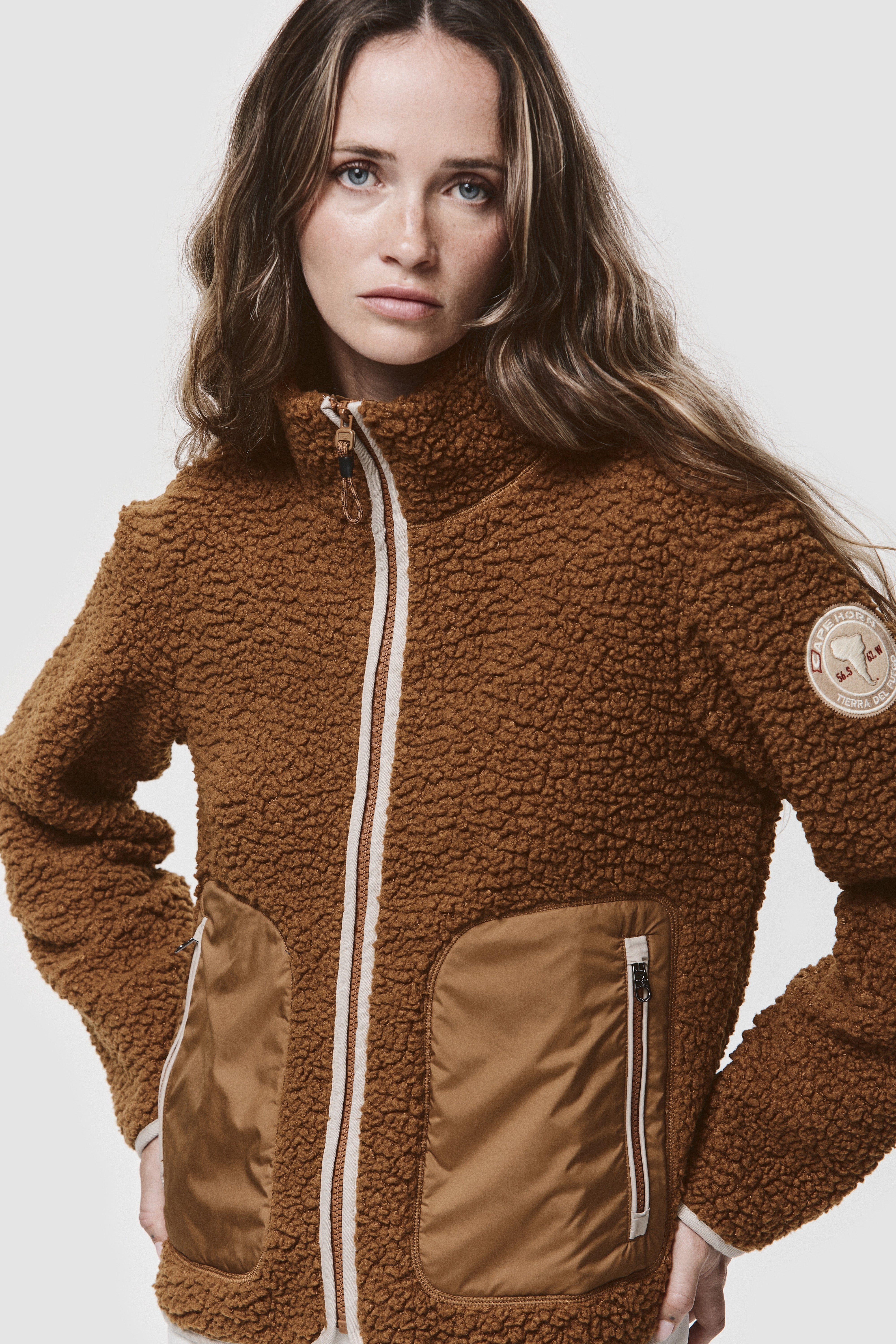 Women's soft teddy fleece jacket, designed to offer warmth and comfort on the coldest days. The enveloping structure is enhanced by a front zip and side pockets, outlined on the outside by a smooth fabric insert that enhances the line. Elastic tape on the cuffs and hem for a practical and comfortable fit, ideal for wearing on its own or as a mid-layer. A versatile garment, perfect for traveling, outdoor activities, or everyday wear.