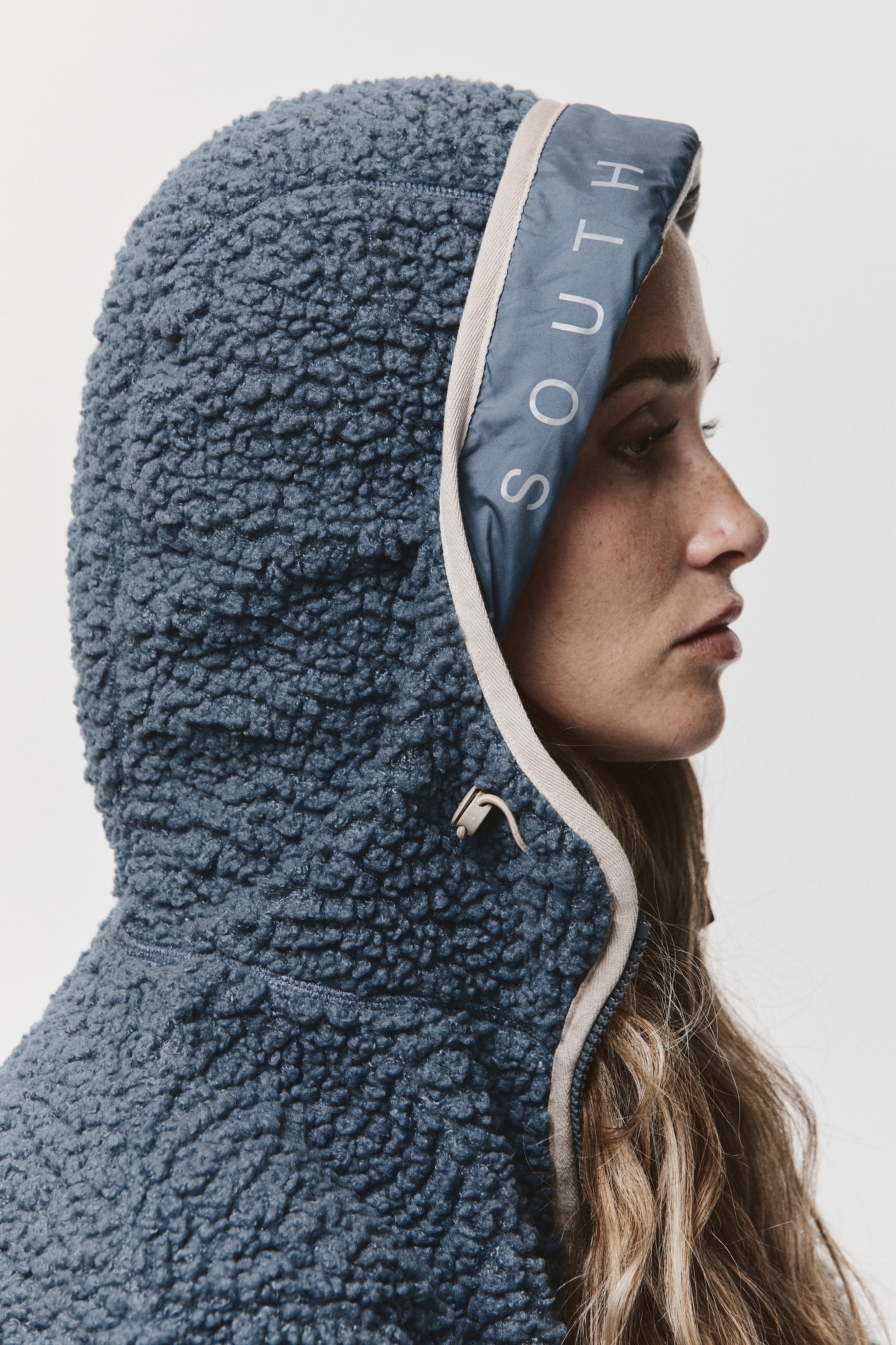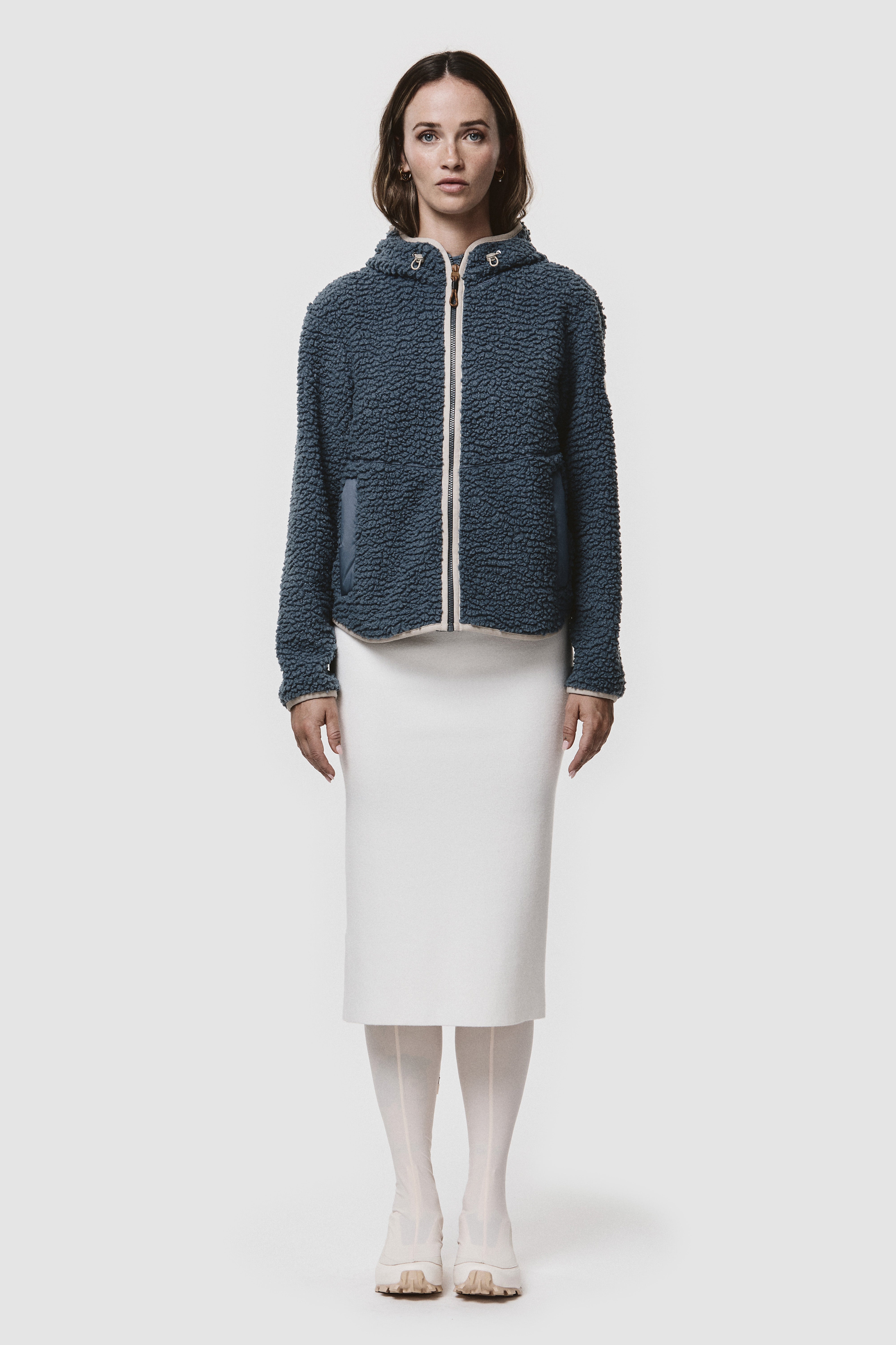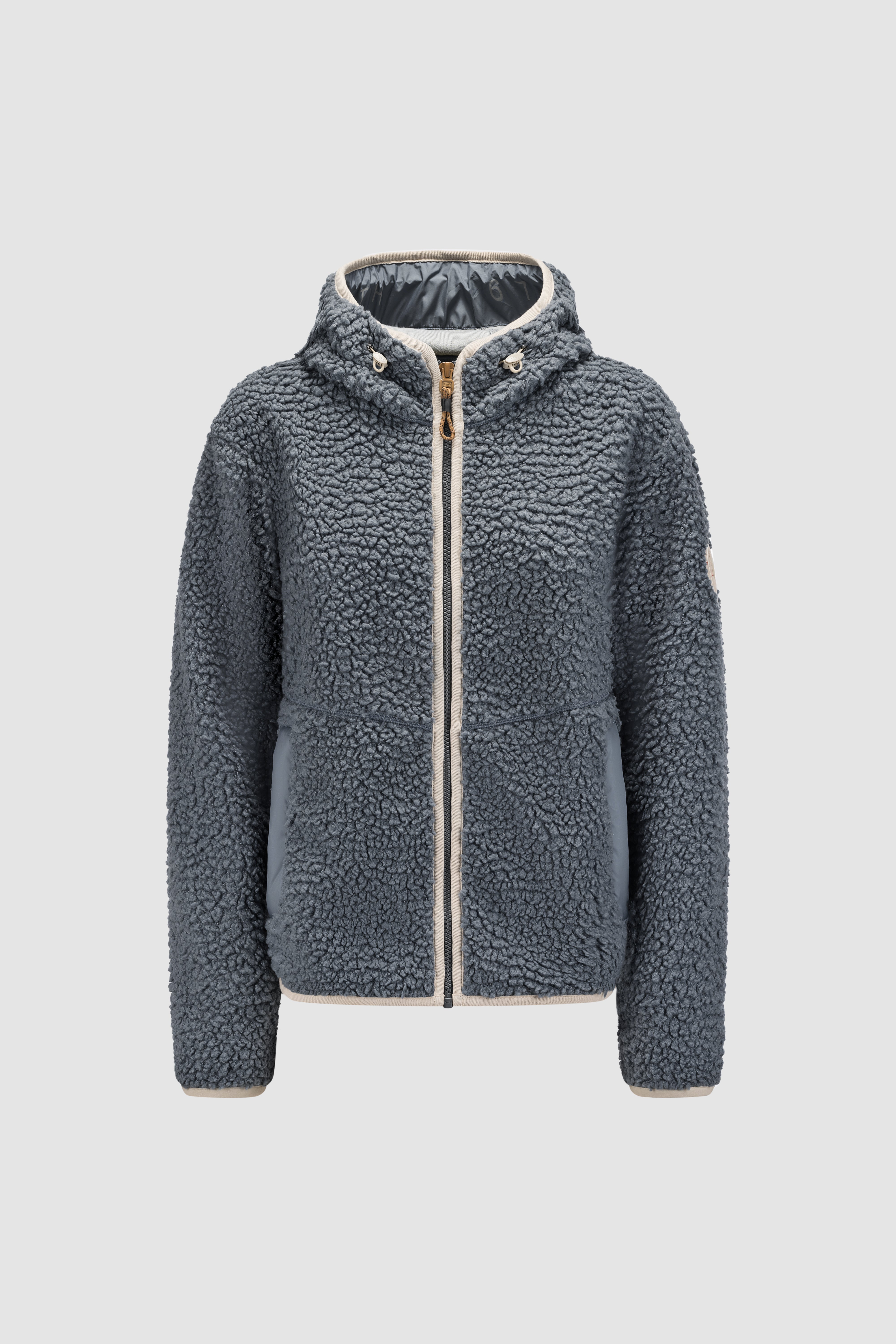 Women's soft teddy fleece jacket, designed to offer warmth and comfort on the coldest days. Fixed hood with drawstring adjustment, front zip, and side pockets with hidden flap closure for a clean, functional look. Elasticated cuffs and hem to retain heat and improve fit. A versatile and practical garment, to be worn as a mid-layer or on its own in milder climates.