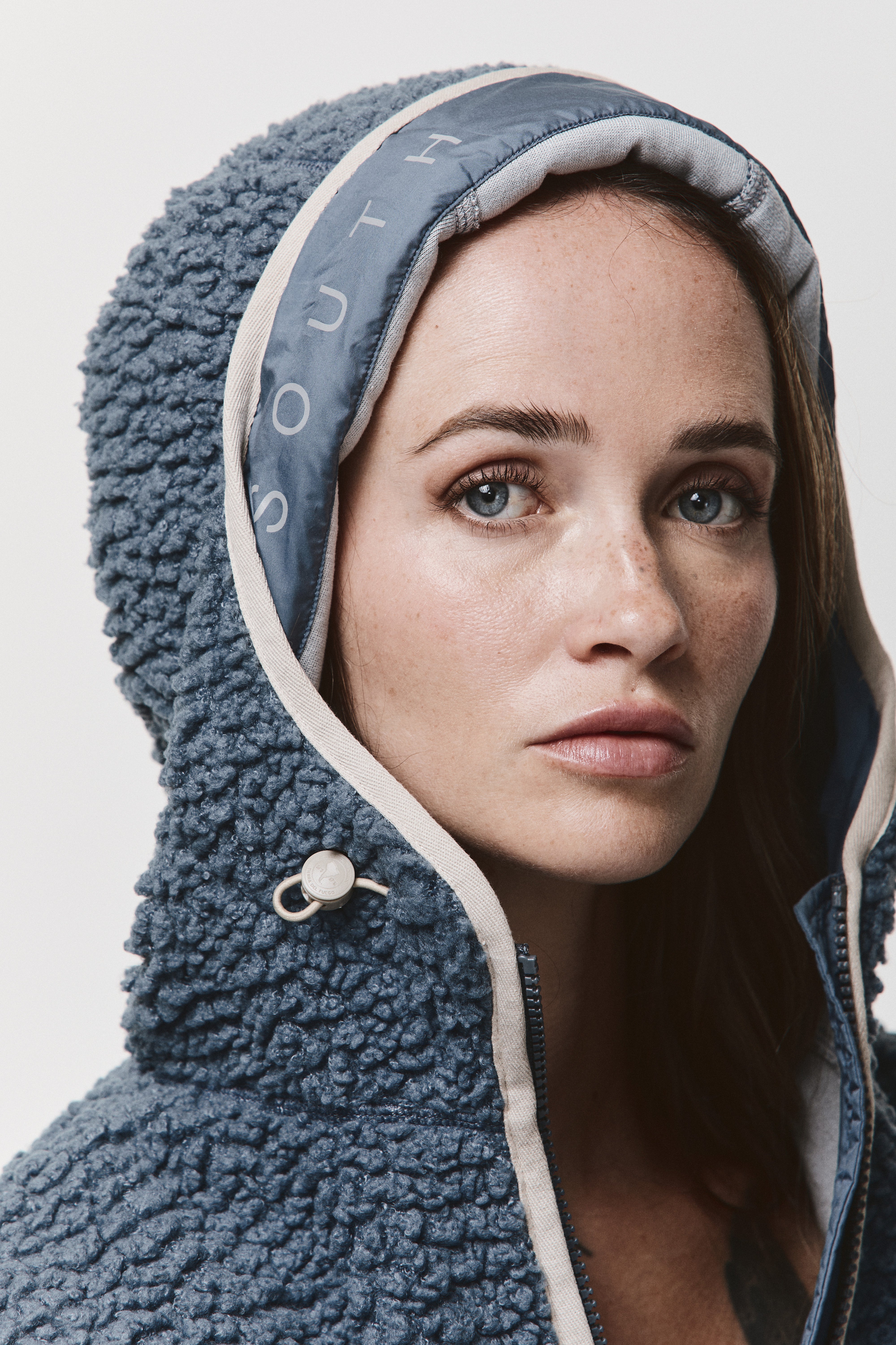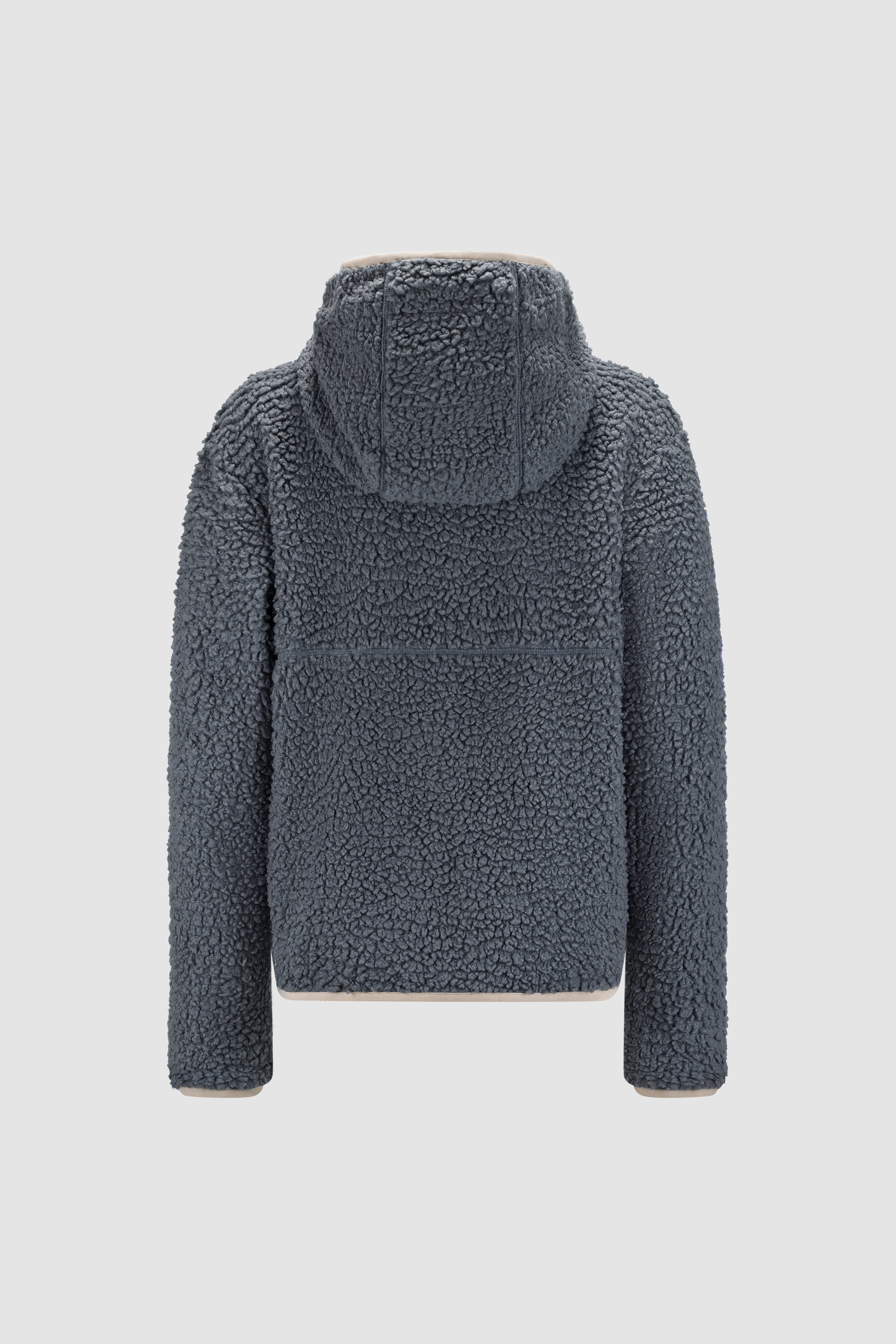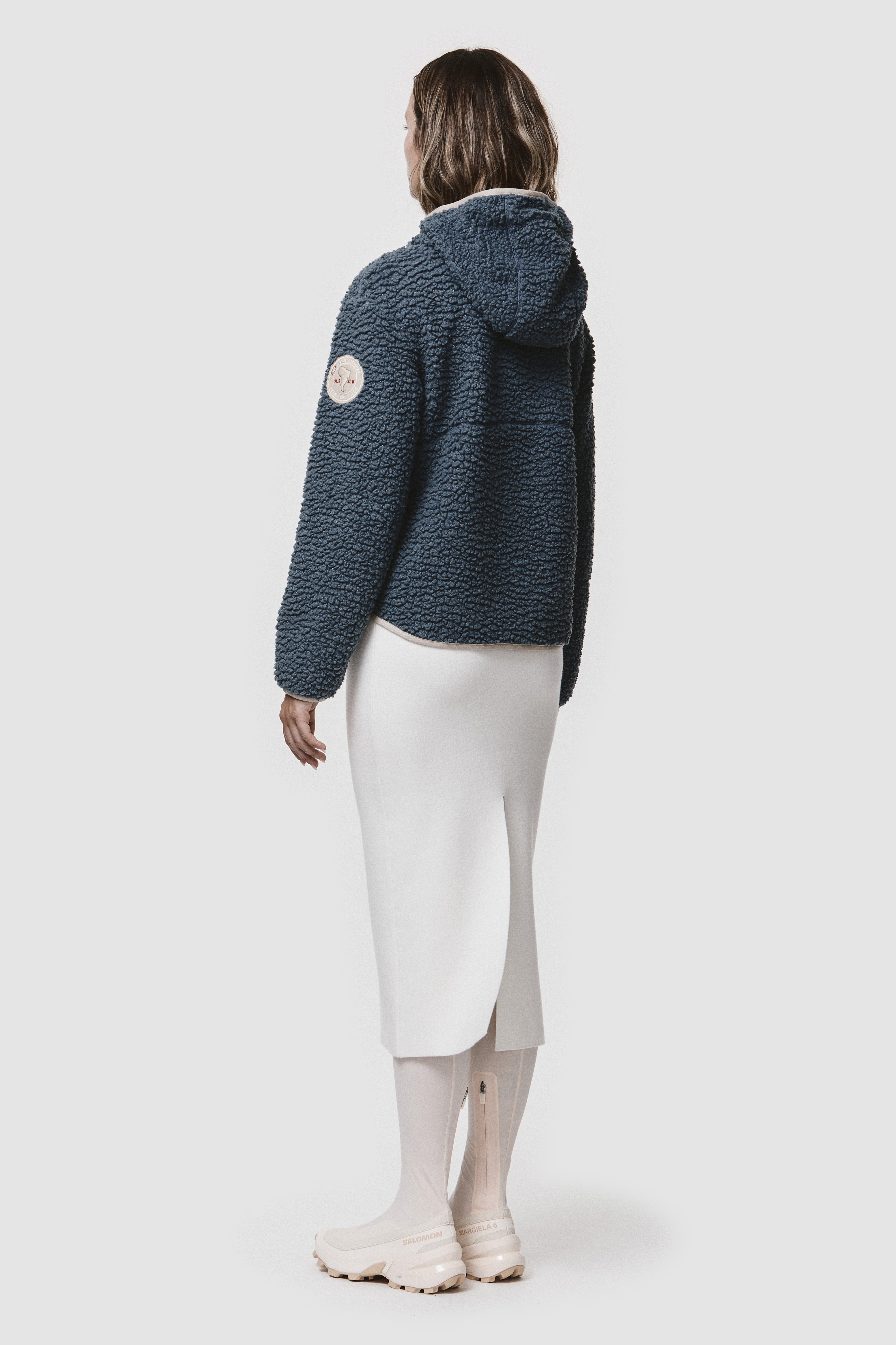 Women's soft teddy fleece jacket, designed to offer warmth and comfort on the coldest days. Fixed hood with drawstring adjustment, front zip, and side pockets with hidden flap closure for a clean, functional look. Elasticated cuffs and hem to retain heat and improve fit. A versatile and practical garment, to be worn as a mid-layer or on its own in milder climates.