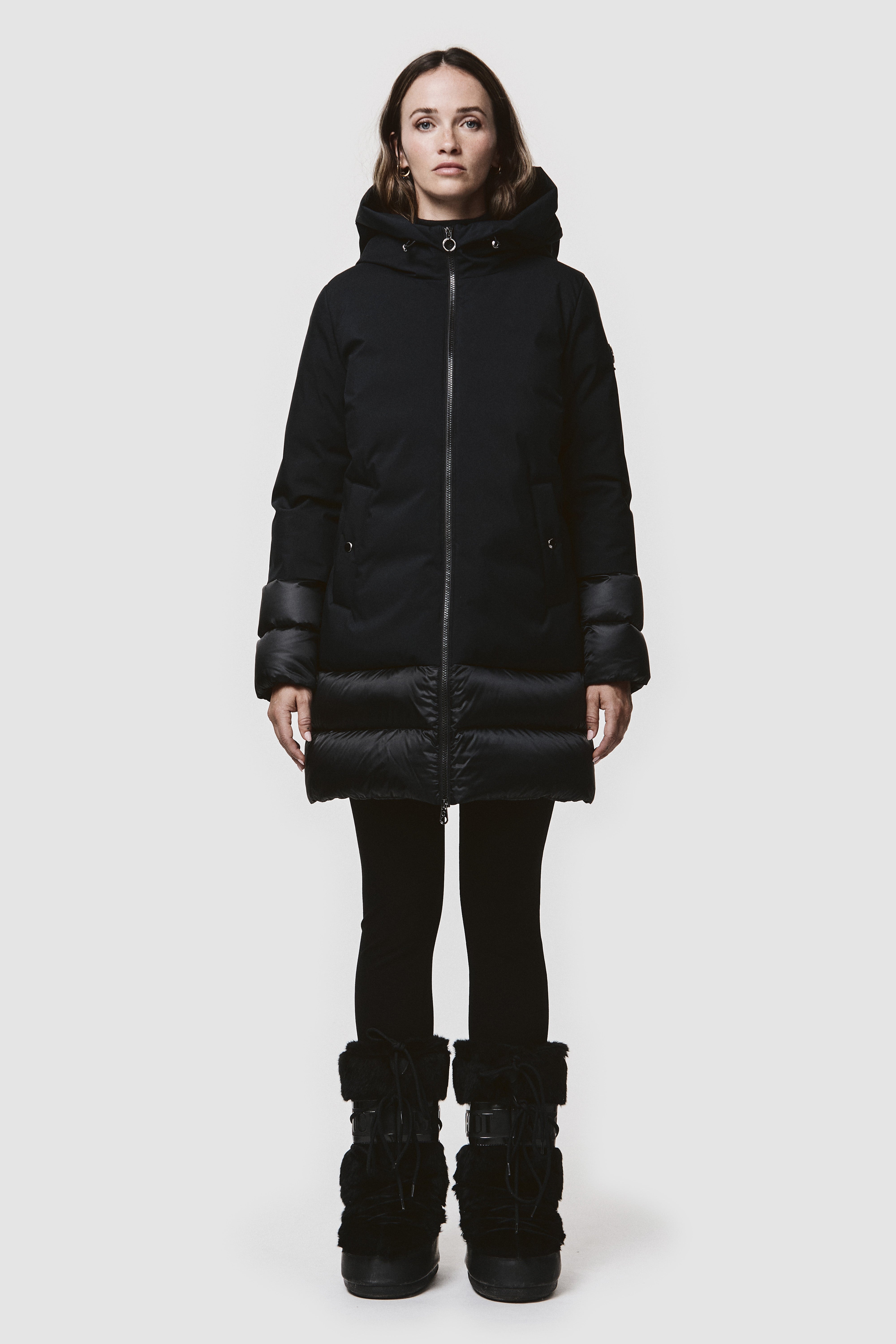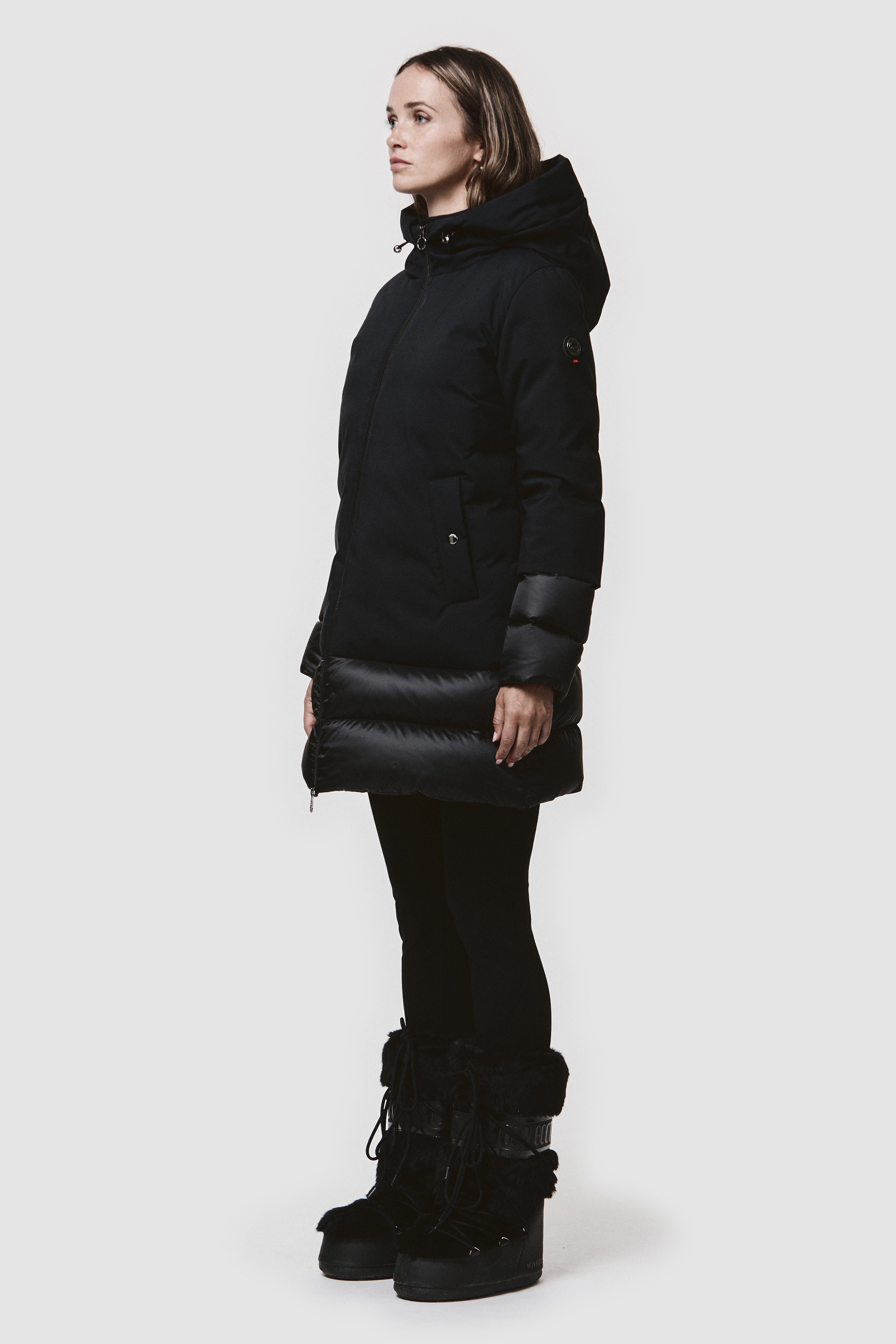 Giacca da donna in tessuto laminato SCUBA impermeabile. Imbottita in piuma naturale, garantisce comfort termico fino a -10°C mantenendo leggerezza e struttura. Zip frontale e tasche con doppio cursore, cappuccio fisso regolabile con coulisse. I dettagli lucidi e trapuntati, posizionati alle estremità della giacca, aggiungono carattere a una linea sobria e contemporanea. Completa il capo una tasca interna portadocumenti, utile negli spostamenti quotidiani.