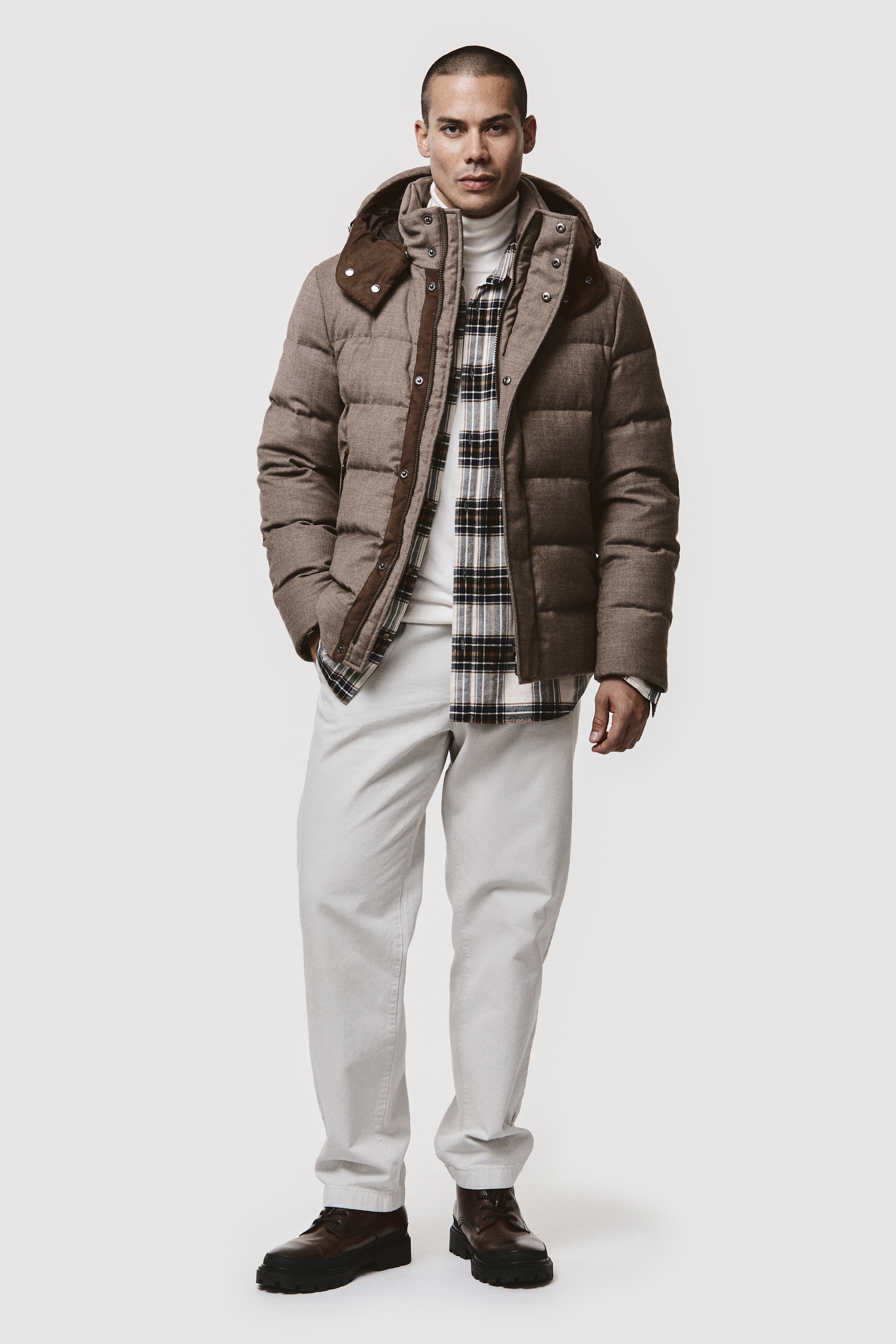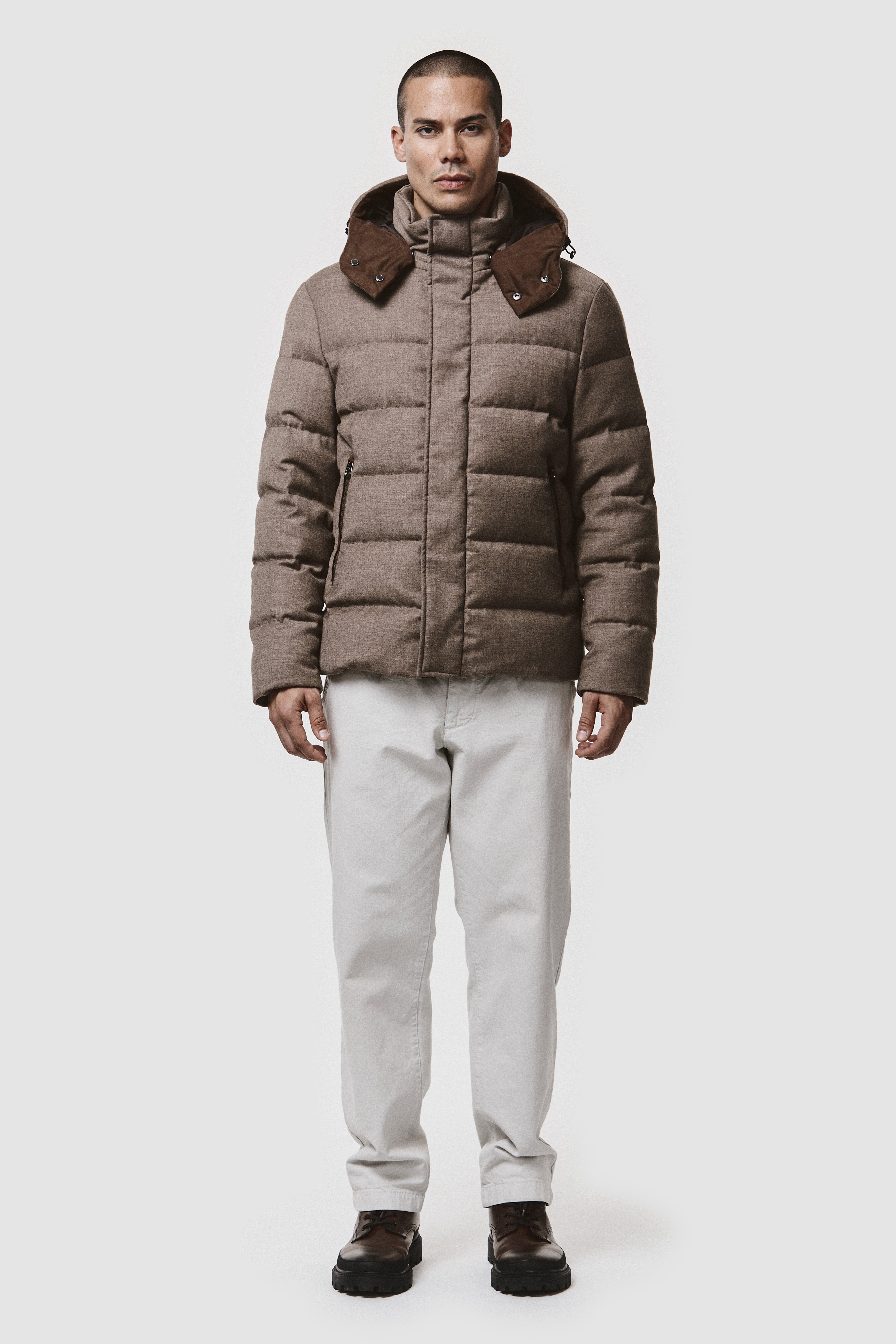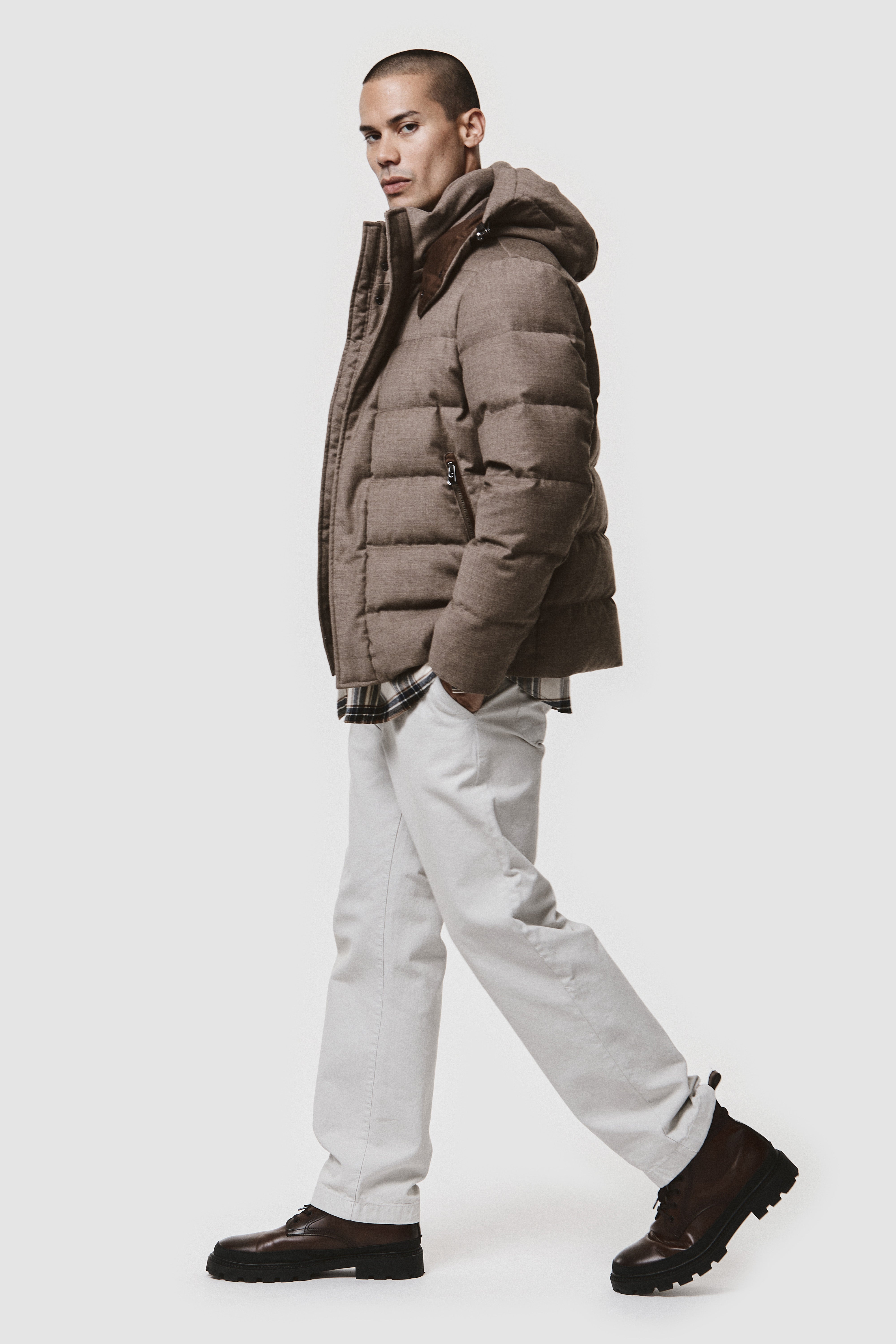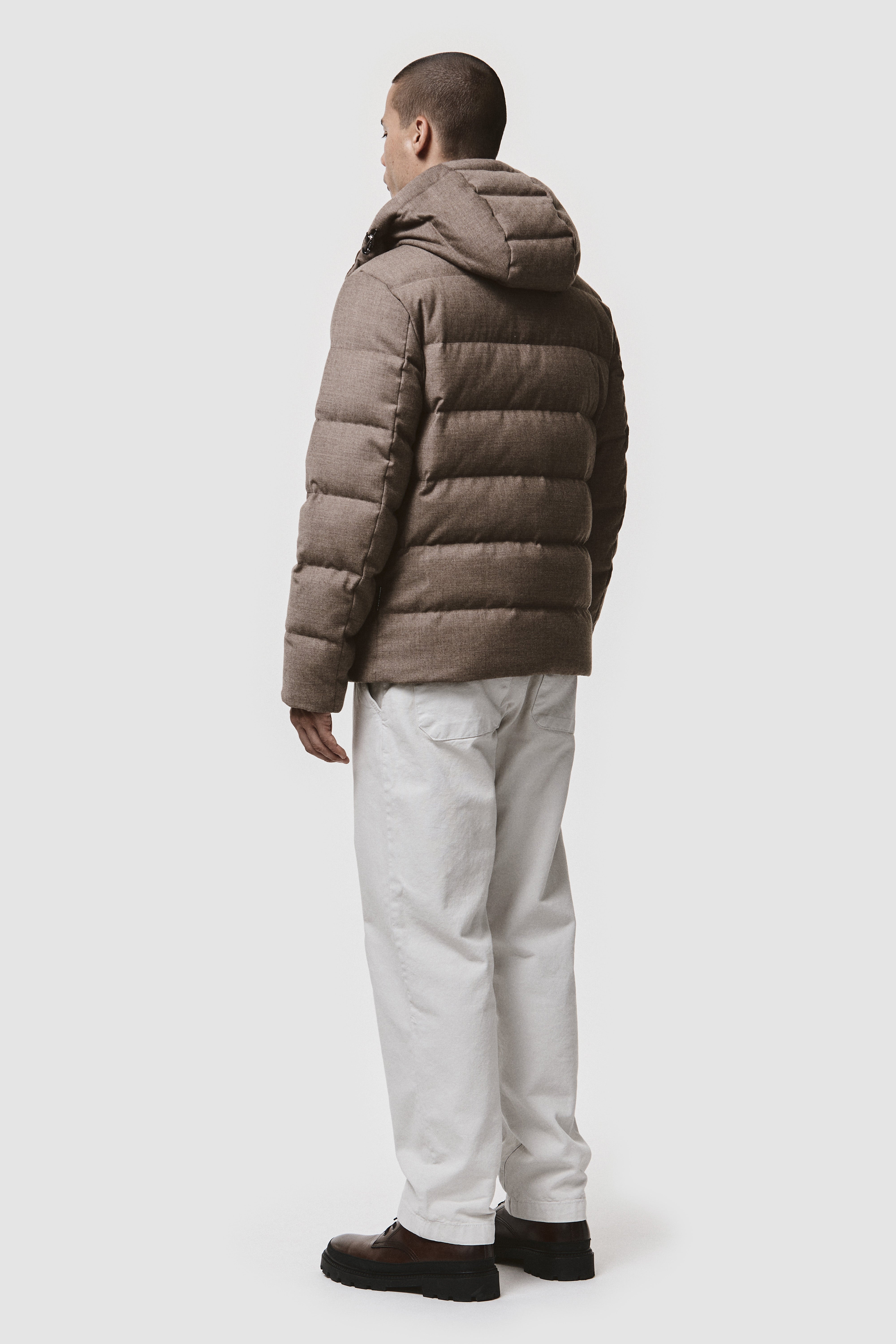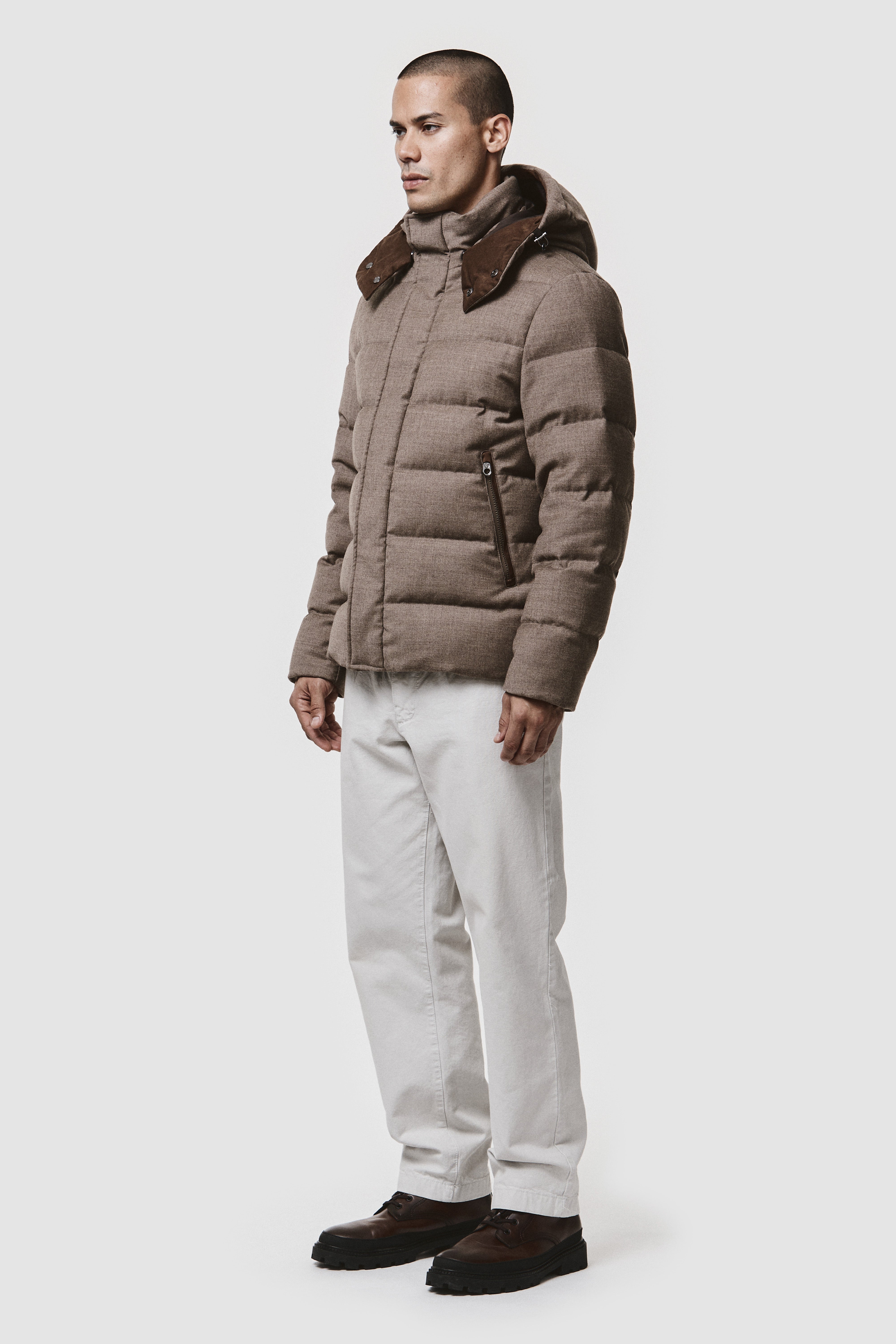 Piumino da uomo in lana trapuntata, imbottito in piuma naturale e studiato per offrire protezione termica fino a -10°C. Il cappuccio staccabile e regolabile con coulisse consente di adattare il capo in base alle condizioni climatiche, mentre il fondo giacca regolabile assicura maggiore aderenza e isolamento. La chiusura centrale prevede una zip a doppio cursore nascosta da pattina con bottoni, e le tasche laterali sono dotate di zip robuste nello stesso stile tecnico. Due tasche interne portadocumenti completano la funzionalità del capo. Parte della capsule Laboratorio, è pensato per chi cerca un equilibrio tra materiali ricercati, costruzione funzionale e stile deciso.