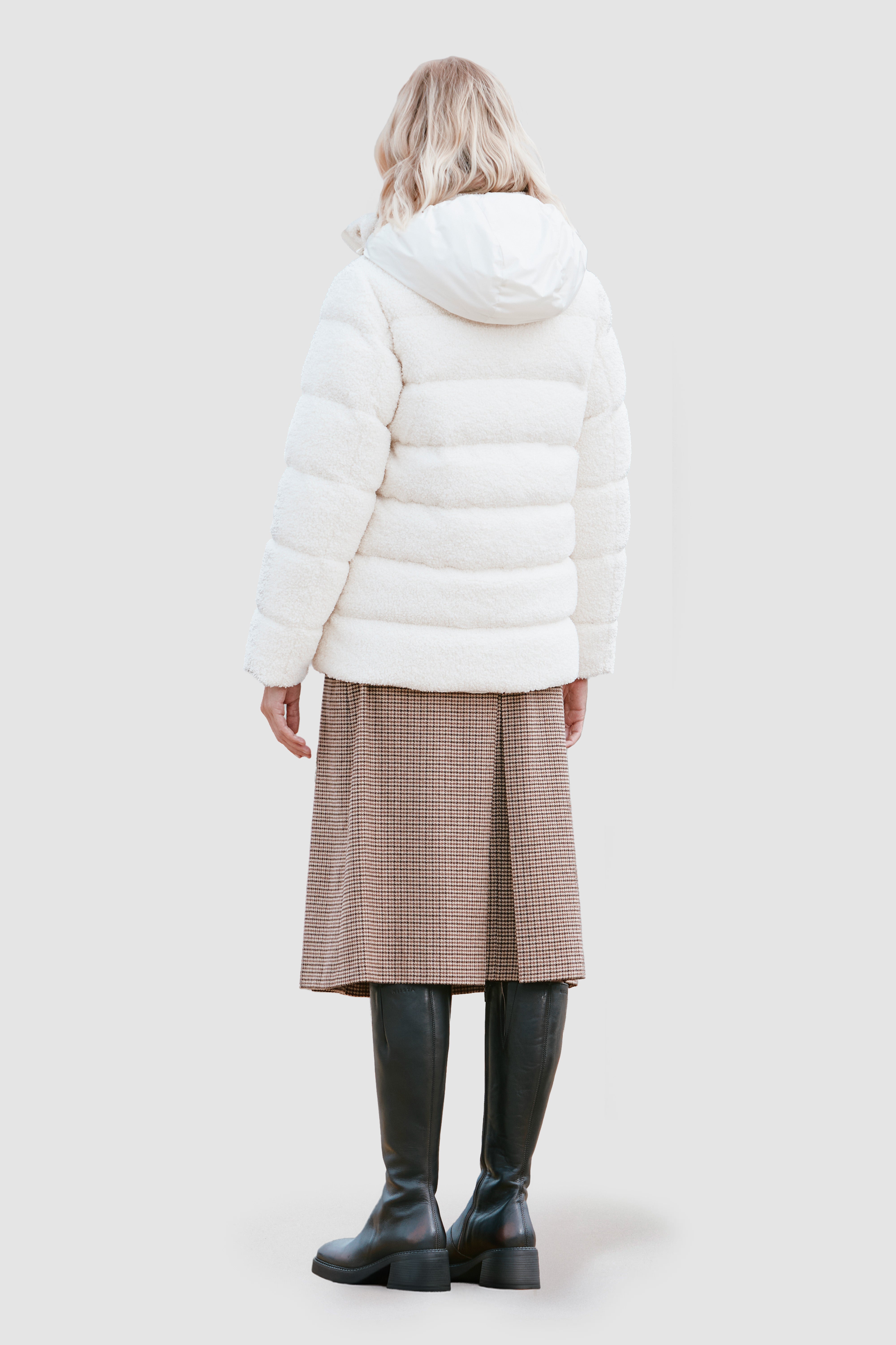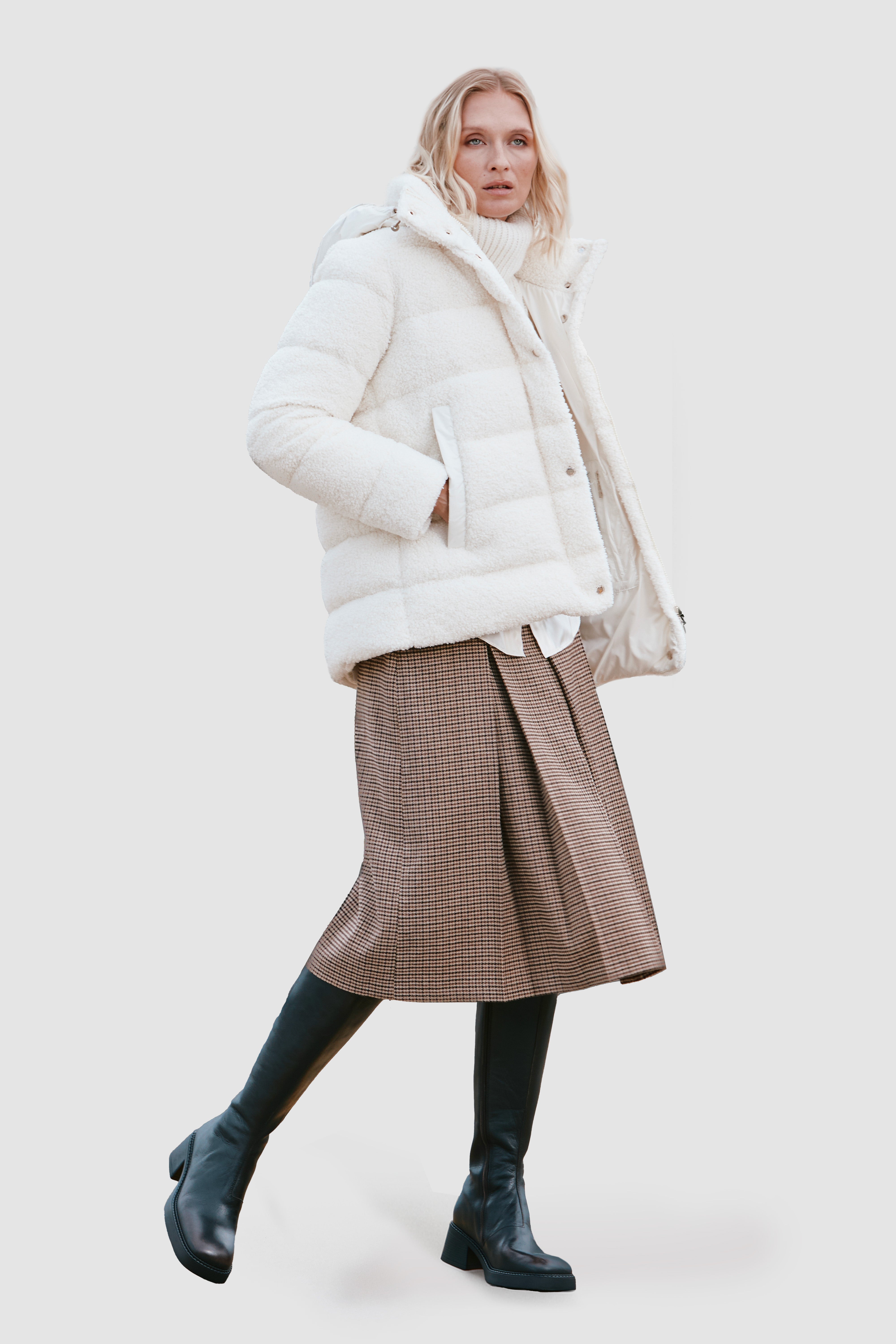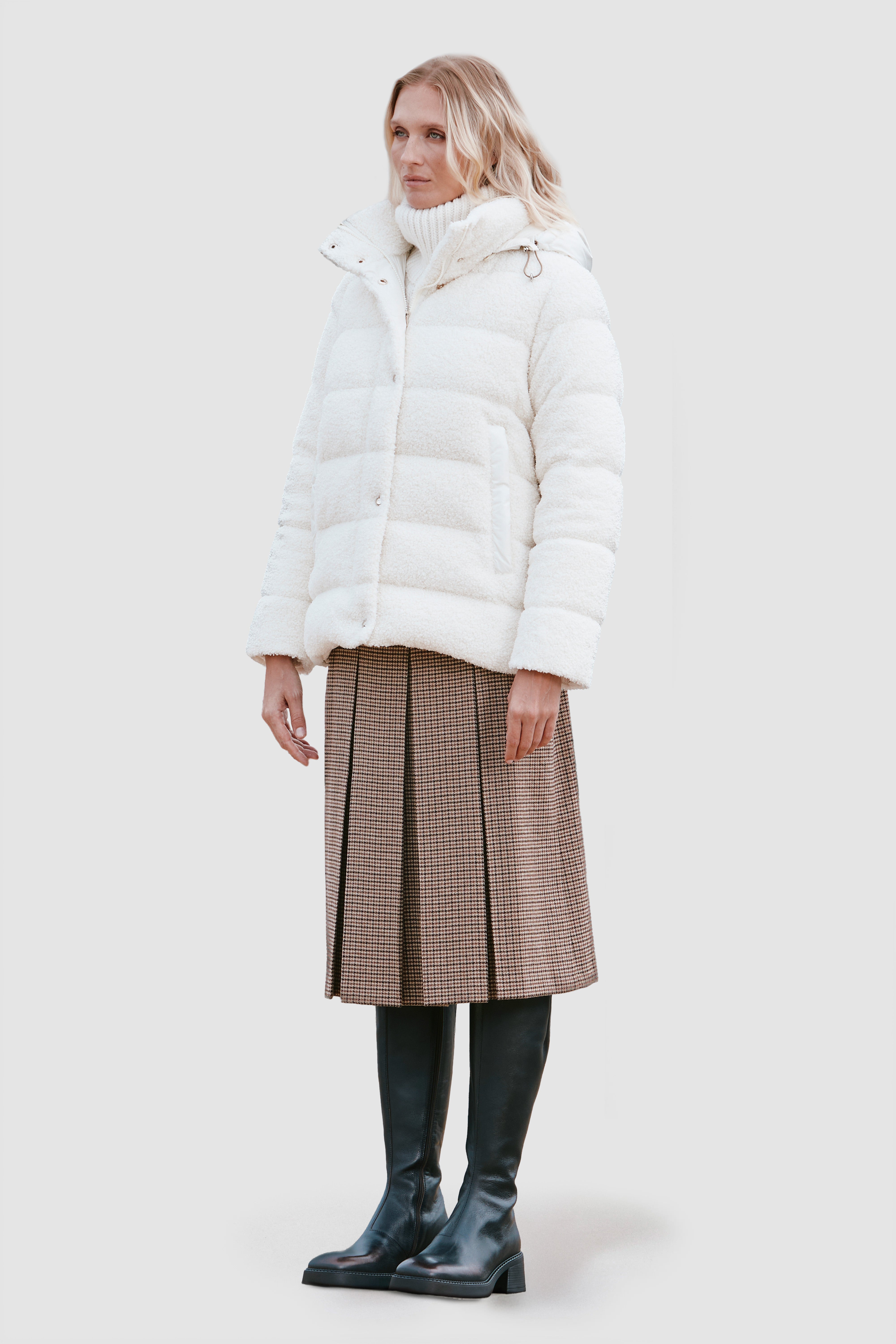 Giacca da donna in tessuto sherpa, pensata per affrontare l'inverno con morbidezza e calore. Il cappuccio fisso in tessuto opaco crea un piacevole contrasto di texture, mentre l'imbottitura in piuma danatra certificata garantisce isolamento termico e leggerezza. Comfort e stile si incontrano in un capo dallo spirito contemporaneo, ideale per il freddo cittadino e le giornate allaperto.