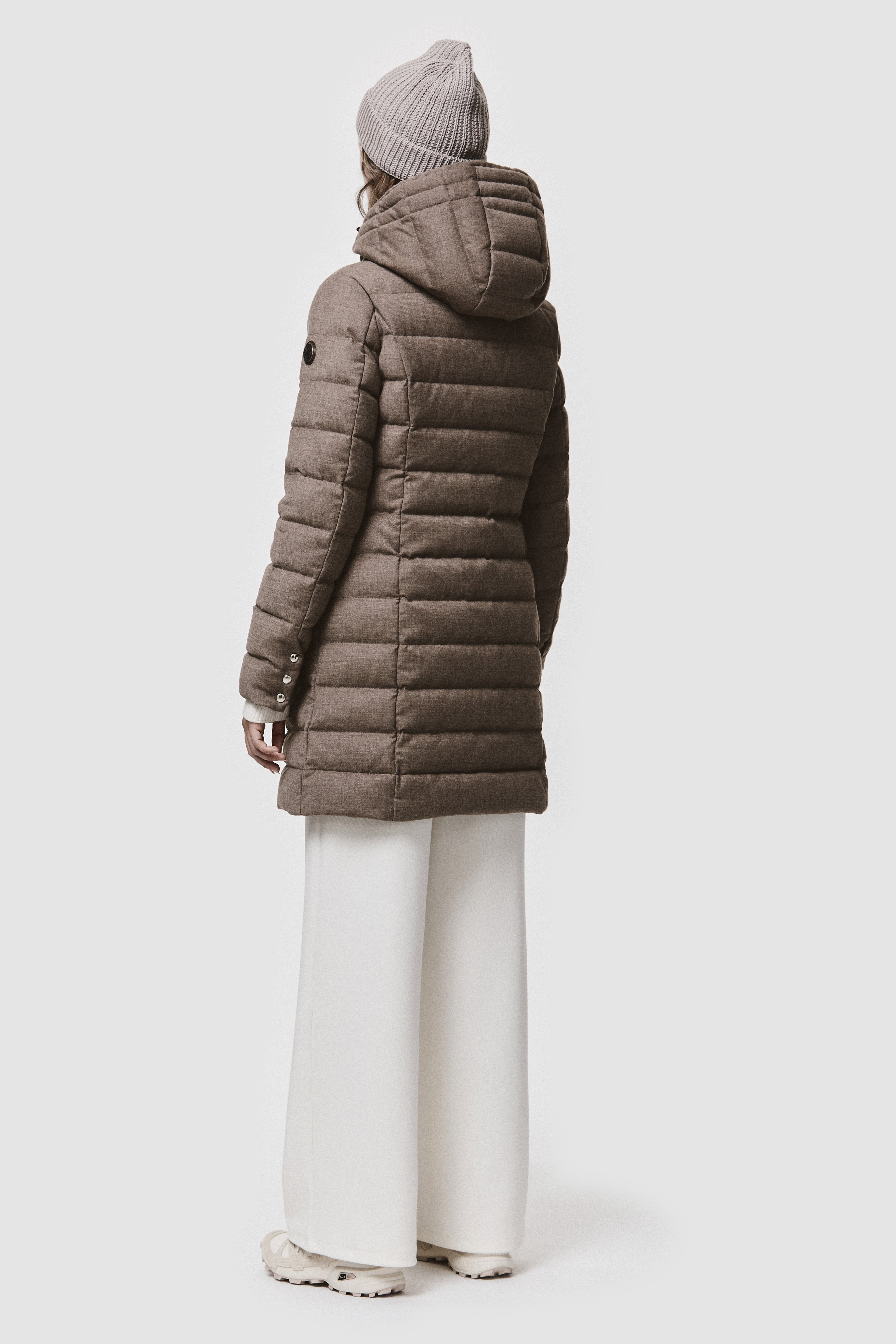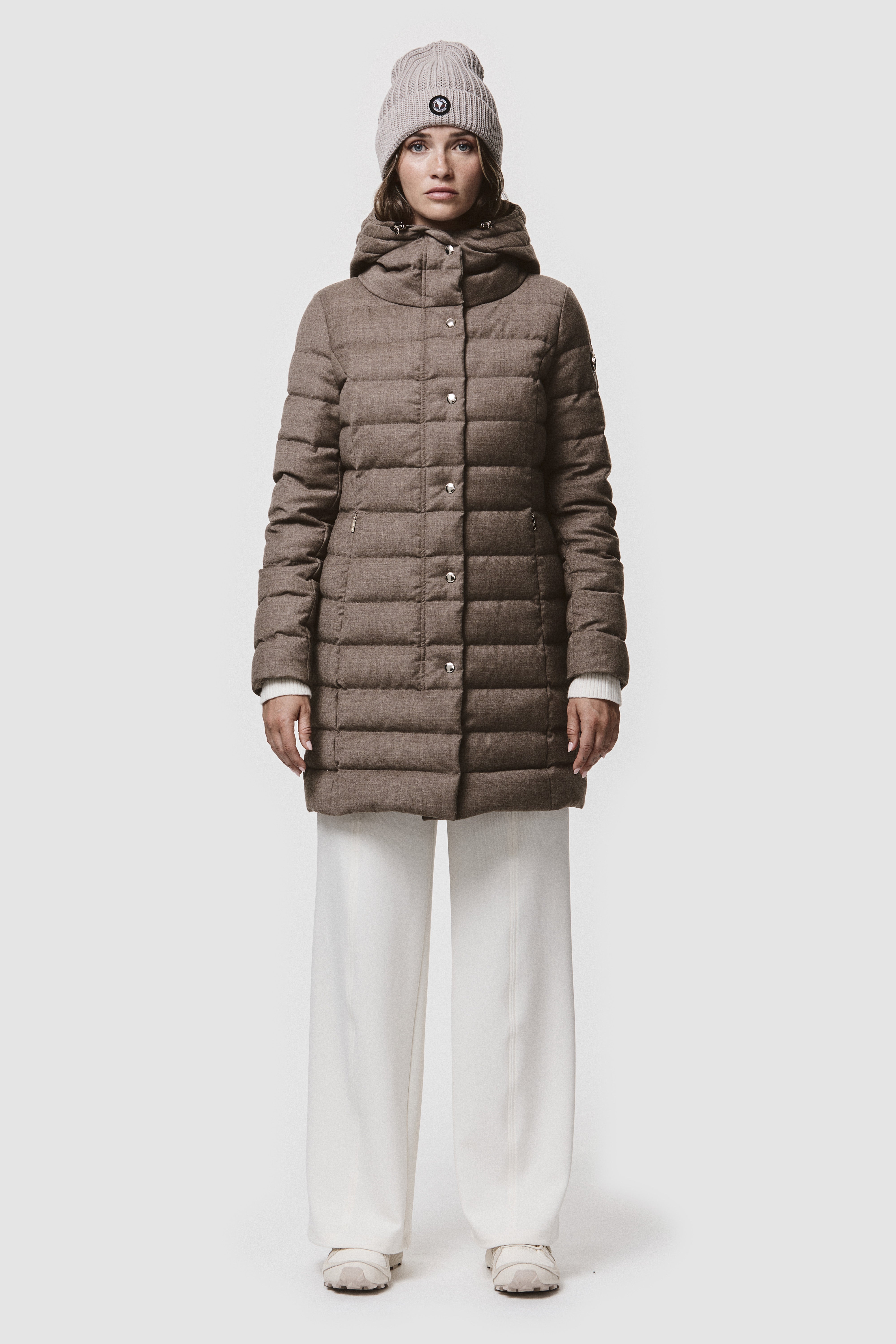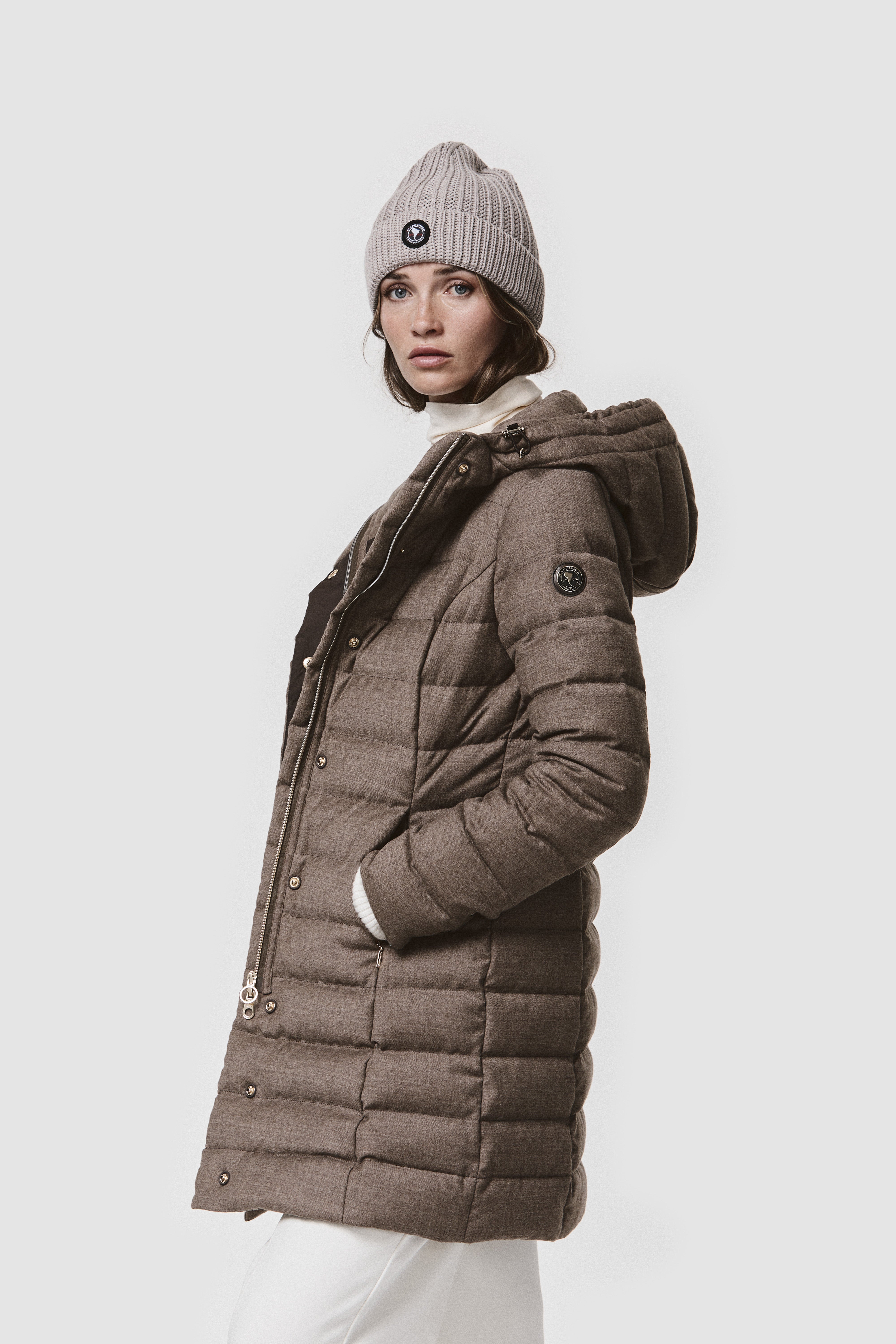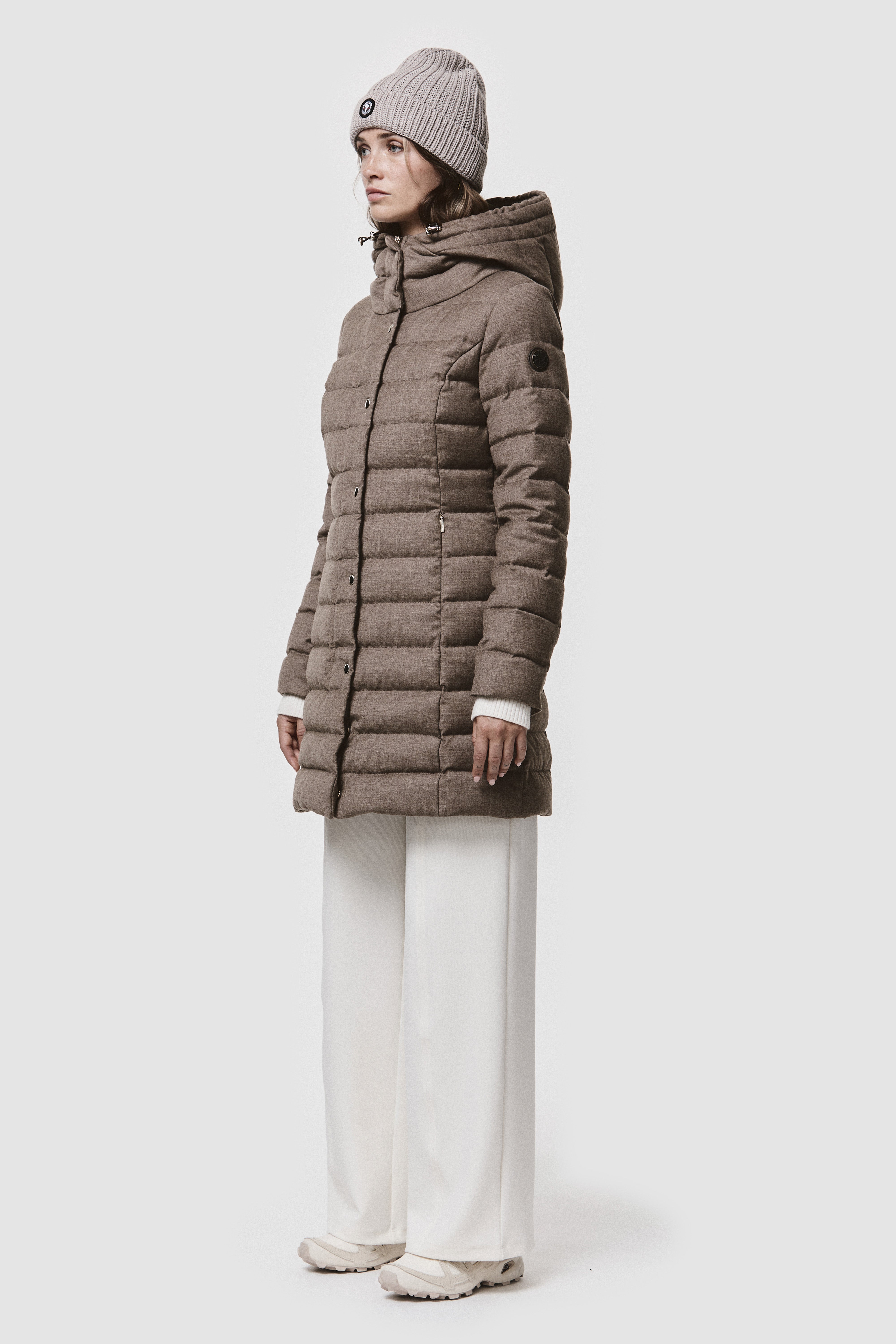 Piumino da donna in lana trapuntata, imbottito in piuma naturale certificata e progettato per offrire calore e comfort fino a -10°C. Il cappuccio fisso è regolabile tramite coulisse, mentre la chiusura centrale con zip a doppio cursore è nascosta da una pattina con bottoni a vista, che conferisce al capo un tocco raffinato. Le tasche laterali con zip invisibile mantengono la linea pulita, e una tasca interna portadocumenti aggiunge praticità all'insieme. Tre bottoni decorativi applicati ai polsi completano il design con un dettaglio sartoriale. Fa parte della capsule Laboratorio, dove la ricerca tecnica incontra un'estetica sobria e contemporanea, pensata per l'inverno urbano.
